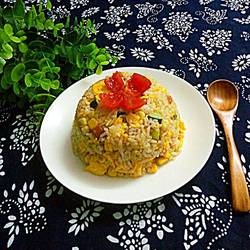6. Pour in diced corn, ham, cucumber and stir-fry, add appropriate amount of thirteen spices, and chopped green onion.Stir well and take it out of the pan and onto a plate.