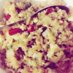 2.Put two spoons of soy sauce, a little sugar, cooking wine and oyster sauce into the rice and mix well