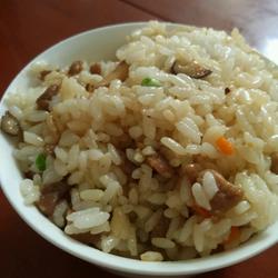 6.Put in rice, stir-fry evenly, pour a little water, cover the pot, simmer for a while, sprinkle in minced green onion, stir-fry evenly, and it is ready to serve