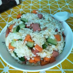 Carrots.Cucumber.Ham sausage.Rice.Garlic cloves ( appropriate amount ) | Oil, salt, chicken essence (appropriate amount) |