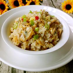 9. Stir-fry the egg and rice evenly.Add seafood soy sauce, pepper and salt and stir-fry evenly.