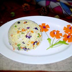 5.Put oil in the pot, pour in the egg liquid, when it is about to solidify, add the rice and let The rice is coated with egg.