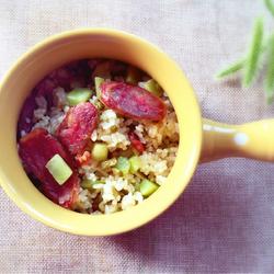 1.Leftover rice must be stir-fried first, otherwise it will easily stick to the pan.2.Since sausages and soaked cowpeas have flavors, be sure to pay attention when adding salt.3.If you don’t have black pepper sauce, you can add a few peppercorns to enhance the flavor.4.Onions and garlic must be added to the pot after serving to avoid burning.