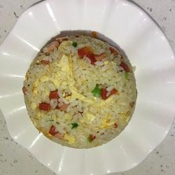 2.Put a little oil in the pot, add the diced carrots and fry until cooked, then set aside.Pour oil into the pot again, pour in egg liquid, when the egg liquid is almost completely solidified, add rice and stir-fry, then add diced carrots, ham sausage and salt and continue to stir-fry.