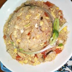 10.When the rice is almost done, add the chopped green onion and stir-fry evenly p>
