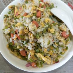 7. Stir well to mix the rice with green pepper, eggs and ham, and it is ready to serve