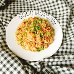 You can sprinkle two-thirds of the chopped green onion first, then turn the plate and put the rest on the rice Just top it, add a little soy sauce to make the rice without the eggy smell, and the color can be evenly colored, and the color is less ugly than ordinary egg fried rice