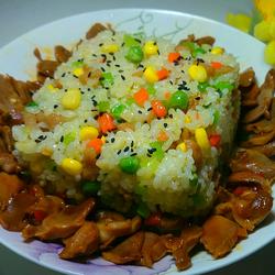 11. After the rice is out of the pot, put the rice into a square container and place it upside down in the middle of the plate.You can add some decorative ingredients around as you like.My fried rice is decorated with stir-fried duck gizzards.For the specific method, please refer to my recipe "Three-stir-fried Jun Gan".