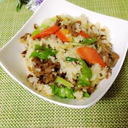 7.Put in the rice and stir-fry.Do not stir-fry together to prevent the mutton from getting old