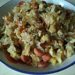 4.Put oil in the pot, fry the chopped green onion and ginger, add the rice and ham, stir the rice They are all granular!