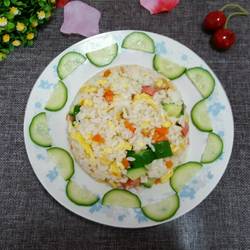 4. After the rice is evenly stir-fried, put all the prepared auxiliary materials into the pot and add Add appropriate amount of salt and stir-fry for a while.