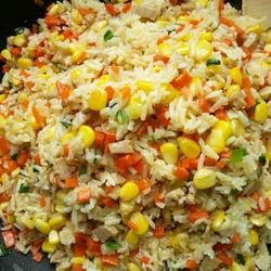 6. Then break up the rice, pour it into the fried ingredients, and stir thoroughly.Turn off the heat and the fragrant corn fried rice is ready~?
