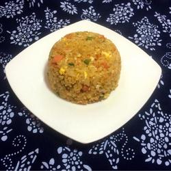 9.Pour the food into a bowl and compact it.Take a plate to cover the fried rice bowl, then place the plate on the table, remove the bowl, and the delicious assorted fried rice is completed.The baby will like it even more if you add ham sausage! !
