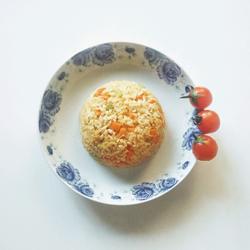 8. Stir-fry for a while and watch the carrots turn yellow., then add the rice, then add the beaten eggs, stir-fry constantly to prevent the rice from burning.When the pot is about to start, add an appropriate amount of salt, chicken essence and remaining soy sauce.After turning off the heat, continue to stir-fry to prevent the pot from being too hot and causing the fried rice to scorch, then press the fried rice firmly into a bowl