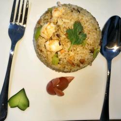 6. Finally, add the prawns and green peppers, seasonings, stir-fry for a while, turn off the heat, and put the fried rice in a round bowl