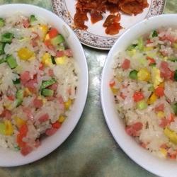 4. Pour an appropriate amount of oil into the pot, heat it to 70% heat, add rice and stir-fry until loose, add diced carrots, corn kernels and green beans and stir-fry for two minutes.Add salt