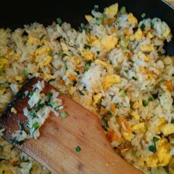 4.Use oil to stir-fry sea urchin and ginger into a paste, add vegetables and eggs and stir-fry, finally add rice and stir-fry evenly