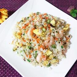 1.Crack the eggs into a basin, wash the shrimps, chop the carrots, blanch the peas, and set aside the rice