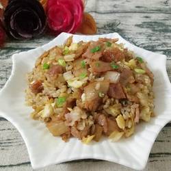 7. Stir-fry the rice Finally, add the fried bacon, eggs and chopped green onions and stir-fry evenly.