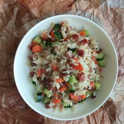 5.After the sausage is cooked, add diced cucumber, rice, add a little salt and stir-fry evenly