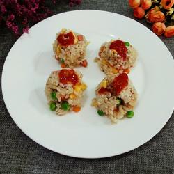 10.Put the fried rice out and let it cool, use disposable gloves to shape into small balls, firm them up, and dip them in tomato sauce