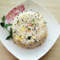 6. Pour the rice into a bowl and place it on the plate, then sprinkle some fried black sesame seeds for decoration After a while, I also put a coriander leaf?