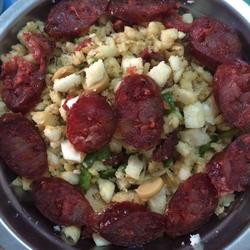 3.Put in oil, fry the diced steamed buns first, then put the green pepper and ham in for 3 minutes.