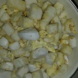 1. Beat the eggs and stir-fry the green onions for about six times.