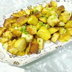 3. Heat the oil in the pot, stir-fry the steamed buns for a while until golden brown, add salt, continue to stir-fry the cumin until fragrant, remove from the pot and put on a plate and sprinkle with chopped green onion.