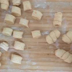 4.Put the warm pumpkin puree into the flour, then add hot milk that is not hot to ferment.Flour