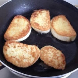 Pour base oil into the non-stick pan , put in the steamed bun slices soaked in egg liquid.