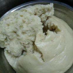 4.Pour the mixed eggs and yeast into the flour.Pour while stirring.