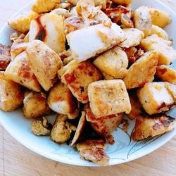 4. If there is some egg liquid left, when the oil is hot and fried, put the remaining egg liquid first, then put the steamed bun pieces in, and slowly fry over medium heat.Stir-fry until the steamed buns turn golden brown.