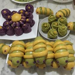 6.Use purple potato dough to decorate the eyes, you can also use black beans or red beans instead