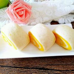 5.If you want the steamed buns to be yellow on the outside, put the yellow dough sheet underneath before rolling, and when rolled, the yellow will be on the outside.