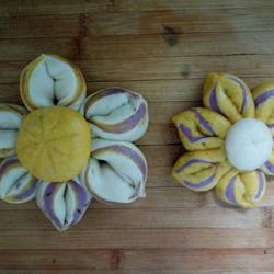 1. Pumpkin and purple sweet potato are steamed and pureed.Knead the three colors of dough separately and let them rise.