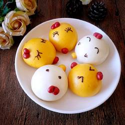 15. Dip the mouth and head decoration of the chicken steamed bun with a little water and glue them to the appropriate parts.