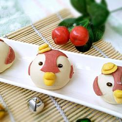 8. Prepare 2 capsules Make 2 discs of different sizes and 1 oval from mung bean and yellow dough