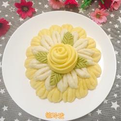 5.Take the yellow dough and divide it into seven Roll the small dough into a round shape, then roll it up from bottom to top and cut it into two roses
