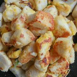 1. Cut the steamed buns into appropriate small pieces, add chopped green onion, egg and salt, then stir to make the egg liquid evenly coat the steamed buns