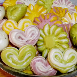 3.3: Cut the dough of each color into basically equal amounts, roll them into circles, and cut Shape into dough slightly larger than dumplings.
