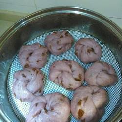1.Peel and cut the purple sweet potato into pieces and steam until cooked.Use a mesh to sift out the purple sweet potato puree.Dry-clean the raisins and cut them into small cubes