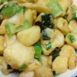 6.Put oil in the pot, add onions, stir-fry until fragrant, add green vegetables, and stir well