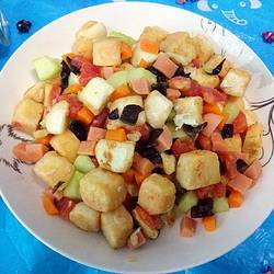 9.Finally add diced steamed buns and stir-fry for 1 minute