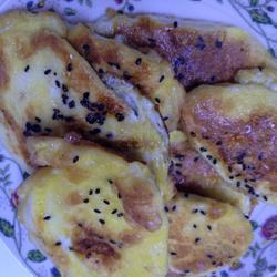 2.Electric cake Brush an appropriate amount of oil into the pot, put the steamed bun slices into the pot, sprinkle black sesame seeds on top, and fry until golden brown on both sides