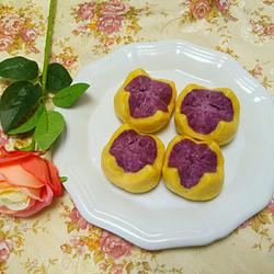 5.Take a piece of pumpkin dough, roll it out, wrap it with a ball of purple sweet potato dough, and put it away Clench your mouth tightly.Close the mouth downwards.