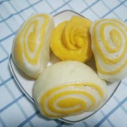 6. Roll the pumpkin dough and white dough into pieces, fold them together and roll them up, and cut them into evenly sized segments with a knife p>