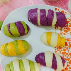 2. Steam the pumpkin and press it into mud with a spoon, sprinkle with baking powder and yeast powder, And add flour! Ditto for purple sweet potatoes! After the spinach is juiced and heated, add baking powder, yeast powder and flour!