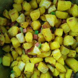 5.Put an appropriate amount of oil in a hot pan, stir-fry the diced steamed buns over low heat.When it is about to come out of the pan, add the cucumber and sausage, stir-fry, and remove from the pan~
