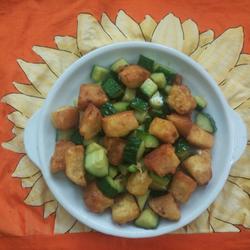 7.Then put Add the fried steamed bun pieces and stir-fry, and add a little oil